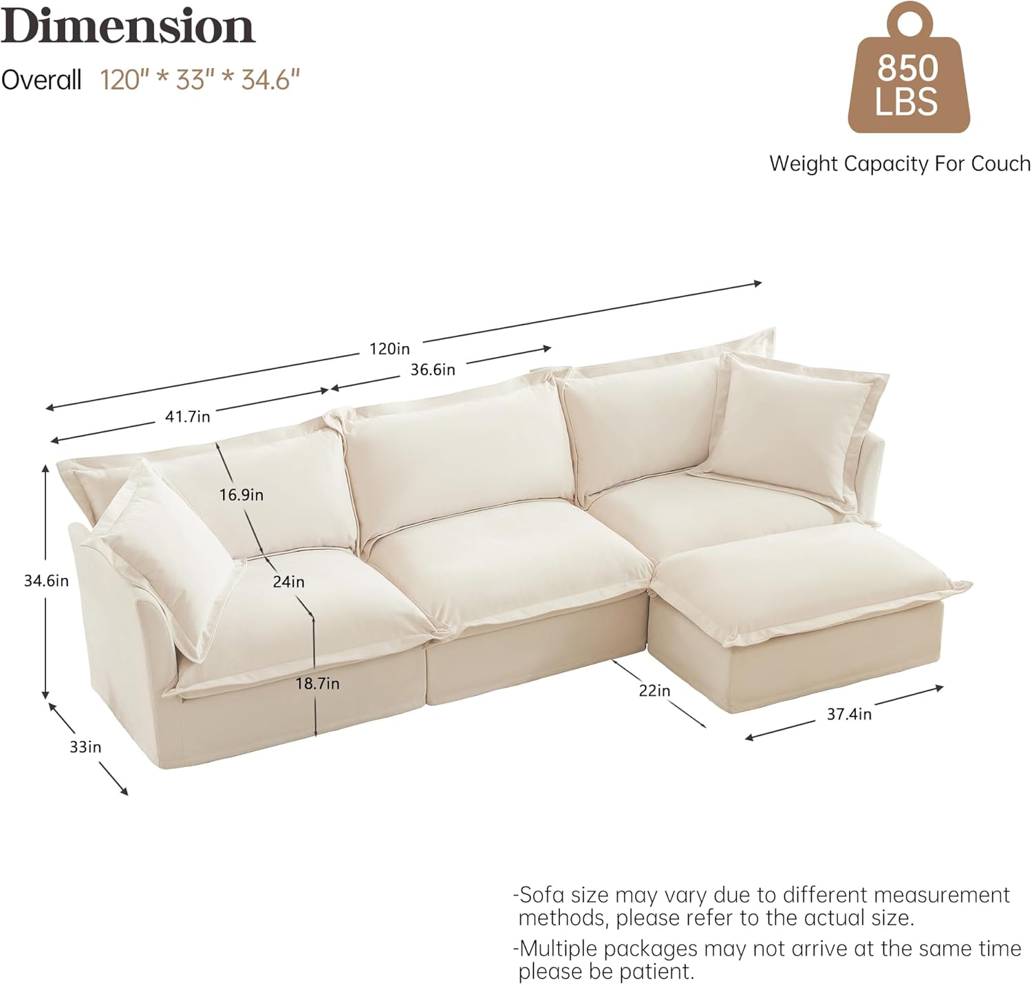 120″ Sectional Sofa Slipcovered, Oversized L-Shaped Cloud Couch with Removable Covers, 3-Seater Sofa Couch with 1 Movable Ottoman, Spacious Living Room Furniture (Cream,Chenille)