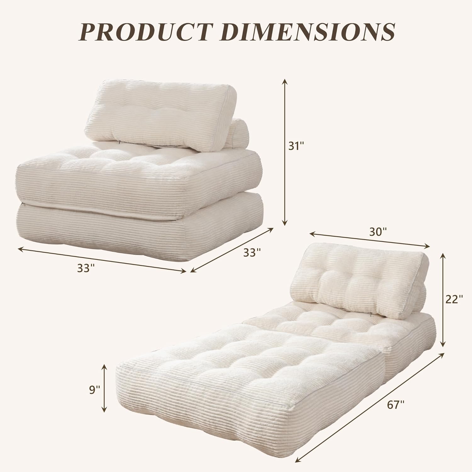 - Premium Corduroy Comfort:Crafted with high-quality corduroy, this mattress combine softness with durability. Designed to retain its shape, the Folding Sofa Bed provides consistent comfort whether used as a bean bag sofa, bed, or lounge sofa chair. Its filling ensures optimal support. The materials guarantee long-lasting use, making this an ideal choice for those seeking a blend of elegance and practicality