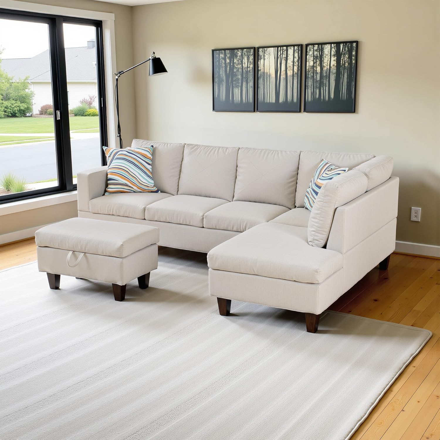 L Shaped Couch Sectional Couch Upholstered Flannelette 3 Pieces Sofas for Living Room with Chaise, Ottoman with Storage for Office and Small Apartment, Off-White