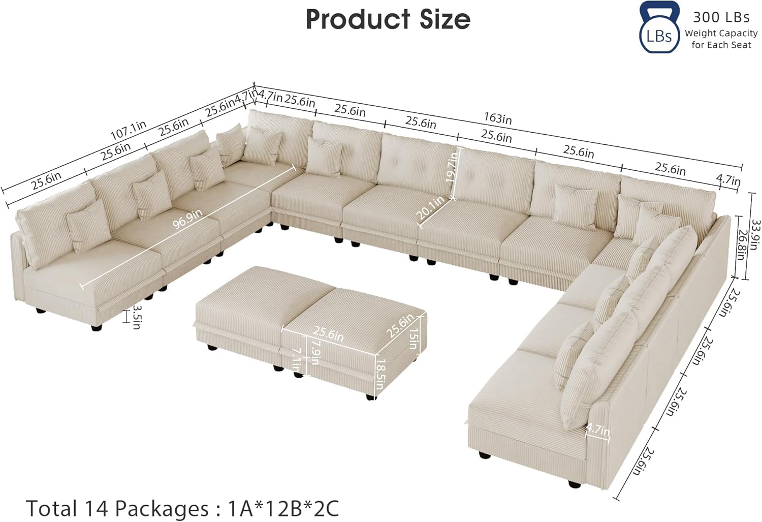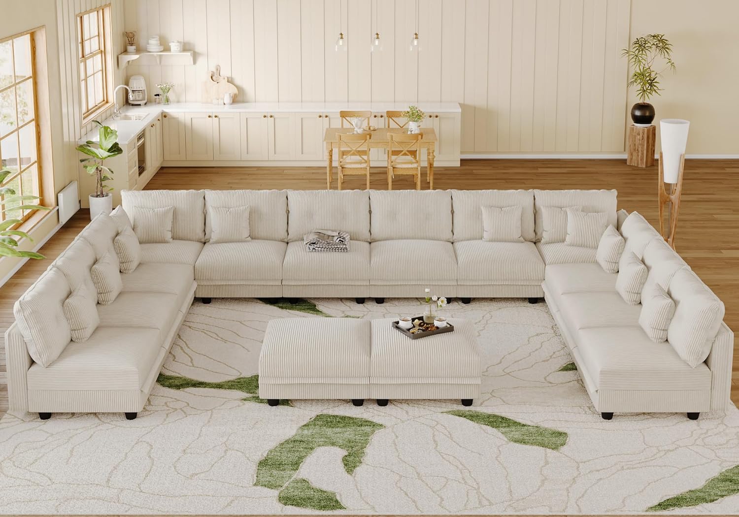 Oversized Modular Sectional Couches for Living Room with Storage | Plush Corduroy, 14-Seater Sofa, 12 Throw Pillows, L/U-Shaped Sleeper, Beige Sofa